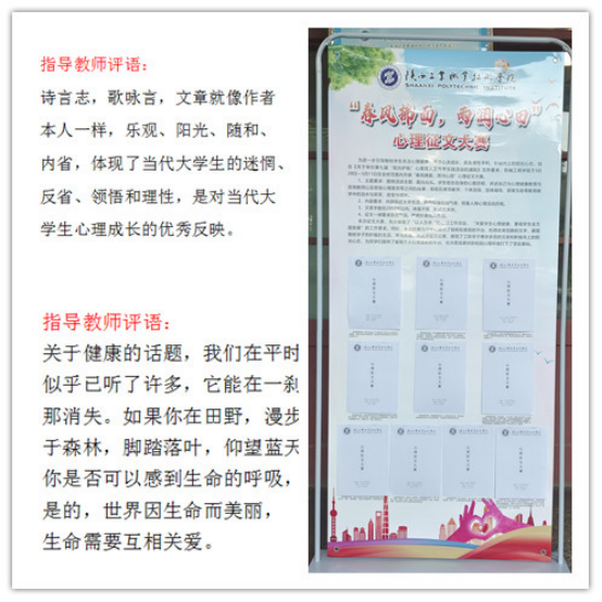 本次征文大赛,充分体现了“以人为本“的心理工作宗旨和“关爱学生心理健康,重视学生全方面发展”的工作要求,为同学们提供了锻炼和表现的平台。同时,也展现了工院学子博学多思的文采和积极向上的阳光心态,为营造更好的校园心理环境打下了坚实基础。