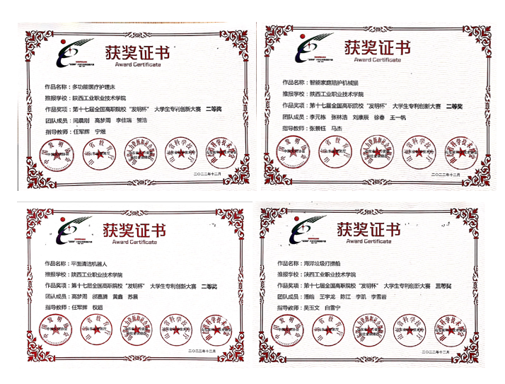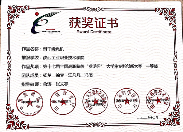 近日,我校领取了由中国发明协会、山东省教育厅、山东省人力资源和社会保障厅等六部门主办,中国发明协会高职发明创新分会、山东理工职业学院承办的第十七届全国高职院校“发明杯”大学生专利创新大赛获奖证书。大赛于2022年11月至12月举行,我校学生的6项参赛作品共获得一等奖1项、二等奖3项、三等奖1项,取得了历届参赛的最好成绩。