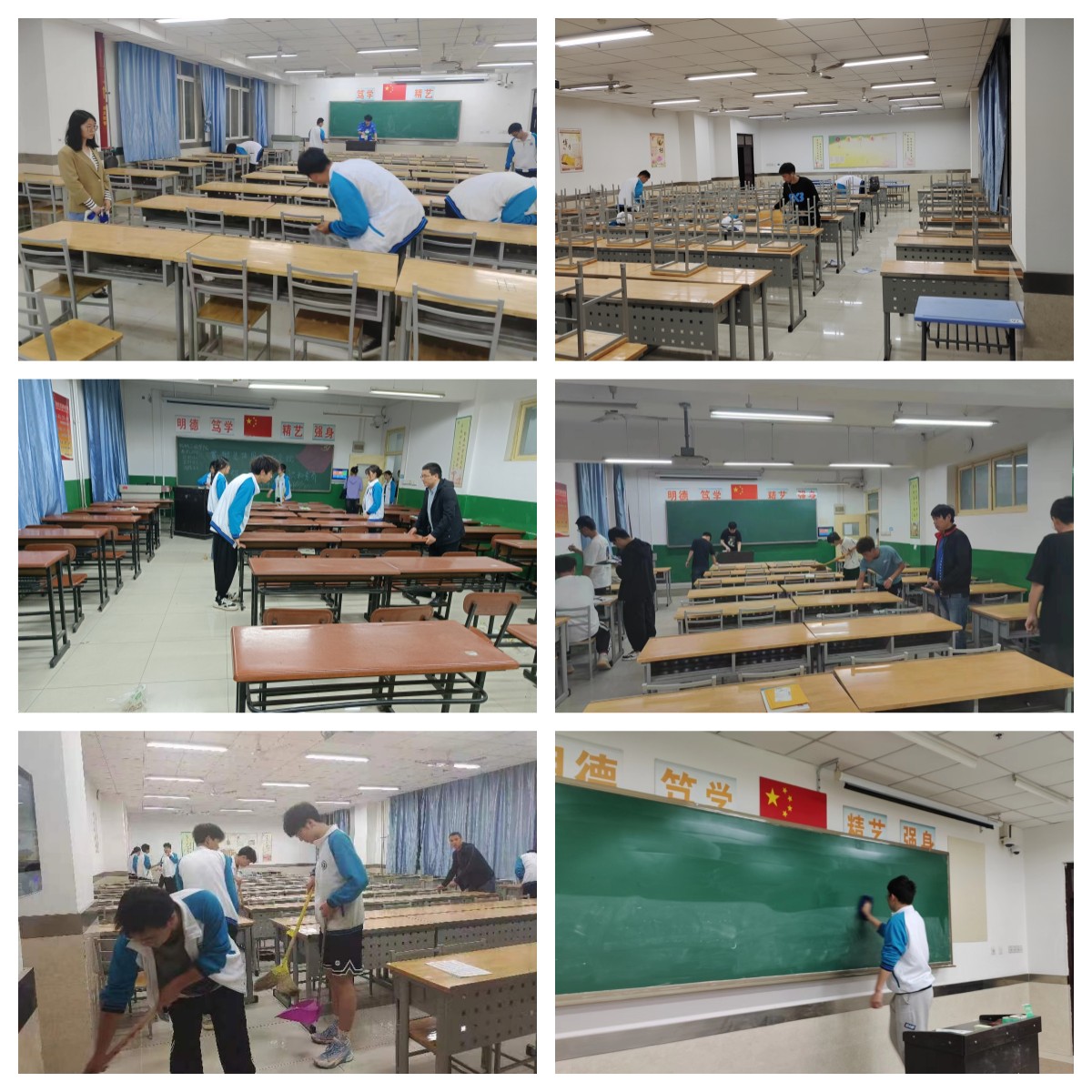 4月16日晚,由学工办组织,各班班主任带队,对所有晚自习教室进行卫生清扫和桌、椅、门、窗净化工作,将教室的桌椅摆放整齐,清扫桌兜和地面垃圾,擦拭桌面级墙壁上的涂鸦文字等,同时要求各班生活委员负起责任,把劳动工作安排到位,确保活动的顺利进行。学生们用自己的双手打扫出了一个干净整洁的学习环境,为整个校园的美化贡献自己的力量。