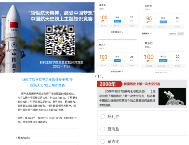 扬帆起航,逐梦九天!2022年是中国空间站建造的决战决胜之年,又恰逢中国载人航天工程30周年。为了更好的传播航天文化、普及航天知识,从航天精神中汲取前行的智慧和力量,推动党史学习教育深入开展,材料工程学院党总支于11月18日至22日面向学院全体教师开展了“领悟航天精神,感受中国梦想”中国航天史线上主题知识竞赛微信答题活动。