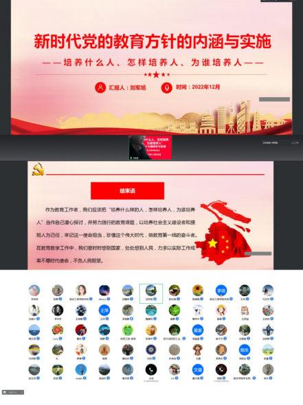 为进一步深入学习宣传贯彻党的二十大精神,深刻领会、准确把握二十大的精神实质和丰富内涵,更好地用二十大精神武装头脑、指导实践、推动工作,12月12日下午,航空学院党总支通过线上的方式开展了党的二十大精神宣讲会暨总支书记讲党课活动。党总支书记刘军旭主持宣讲会并讲授了“新时代党的教育方针的内涵与实施——培养什么人、怎样培养人、为谁培养人”主题党课,航空学院全体教师准时上线参加党课活动。