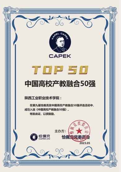 近日,第九届恰佩克奖颁奖仪式暨第十三届中国国际机器人高峰论坛在安徽芜湖召开。大会由安徽省经信厅、中国机电一体化技术应用协会和芜湖市人民政府共同主办。本届恰佩克奖评委会基于大量数据事实严格审核分析,从一百余所国内入围高校中评出“中国高校产教融合50强”,陕西工业职业技术学院成功入选。