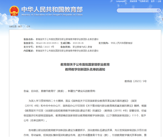 根据2023年6月26日《教育部关于公布首批国家级职业教育教师教学创新团队名单的通知》(教师函〔2023〕5号),我校机电一体化技术专业教师教学创新团队通过教育部首批国家级教师教学创新团队认定,本次认定是我校师资队伍建设取得的重大成果。