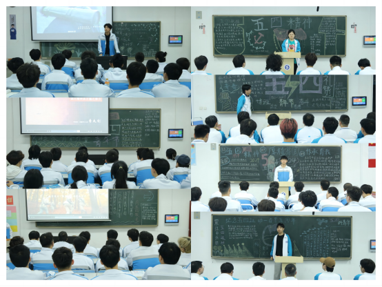 班会开始,各班班长首先向同学们介绍了五四运动的历史背景、历史意义与时代价值,以真实历史激发学生的爱国热情,增强其社会责任感和使命感。各班共同观看五四青年节相关主题微电影,让同学们更直观地了解五四运动的历史情景,瞻仰学习“把青春献给祖国”的拼搏奋斗、勇挑重担,汲取百年前先辈们留给中国青年的精神力量。同学们意气高昂,纷纷表示:民族复兴这场青春长跑的接力棒正传递到新一代青年的手中,我们应把握“此时、此地、此身”,在奋斗中不断提升自己,秉承“技能报国”理想,以聪明才智贡献国家、贡献社会。