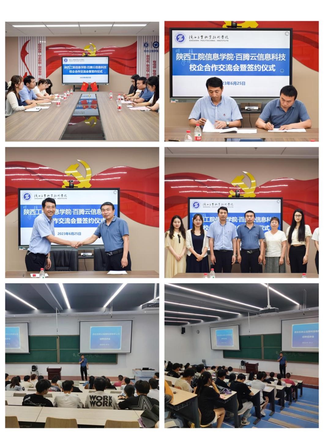 西安百腾云信息科技有限公司总经理汤中美对我院发展情况给予了高度评价,他从基本业务、运营模式、校企合作等方面介绍了企业基本情况,希望能同我院达成长期合作,互利共赢。随后,双方举行了签约仪式。