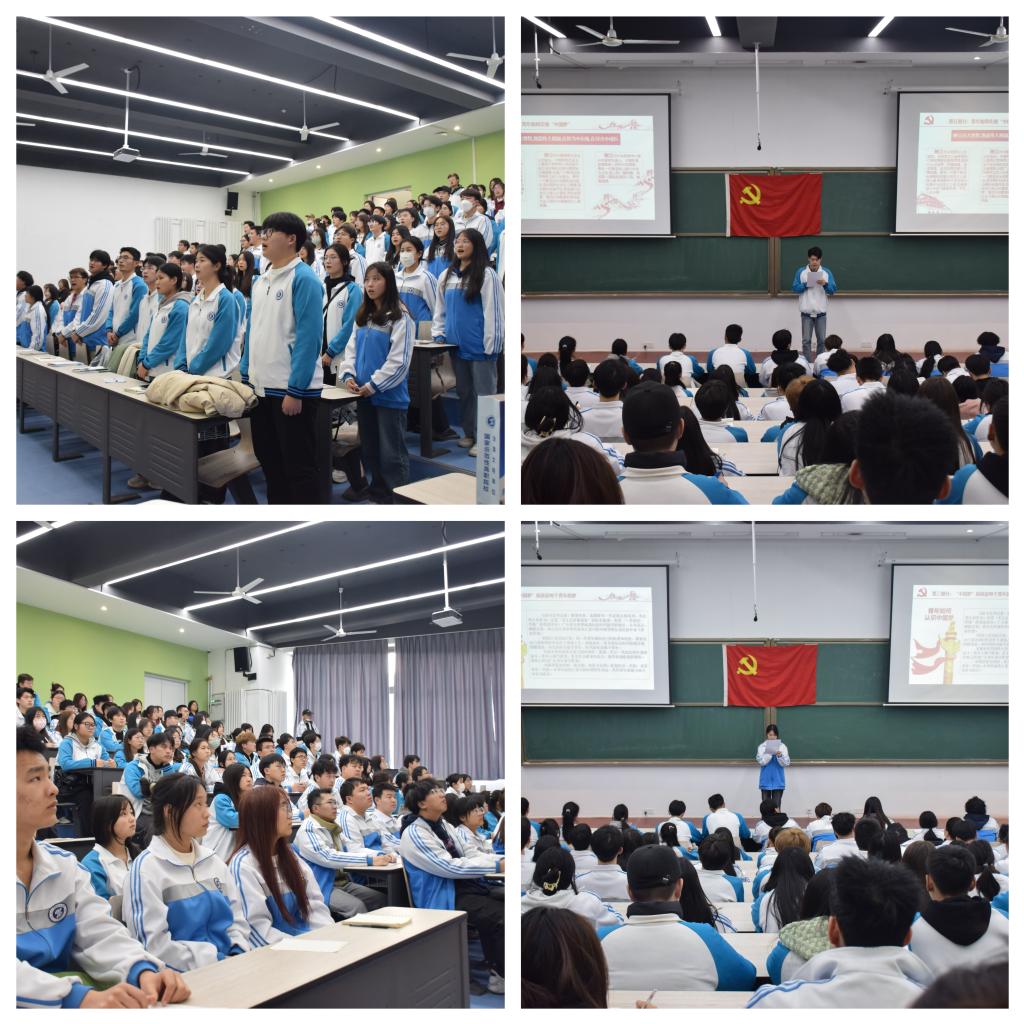 雄壮的国歌奏起悦耳的音符,全体同学齐声高唱国歌,爱国之情在心中激荡。本次活动以讲党课、观影片、畅交流三大部分为主体,紧紧围绕学习党的二十大精神这条主线,探索建功新时代历史意义,引导在场学生坚定理想信念,不忘奋斗初心。