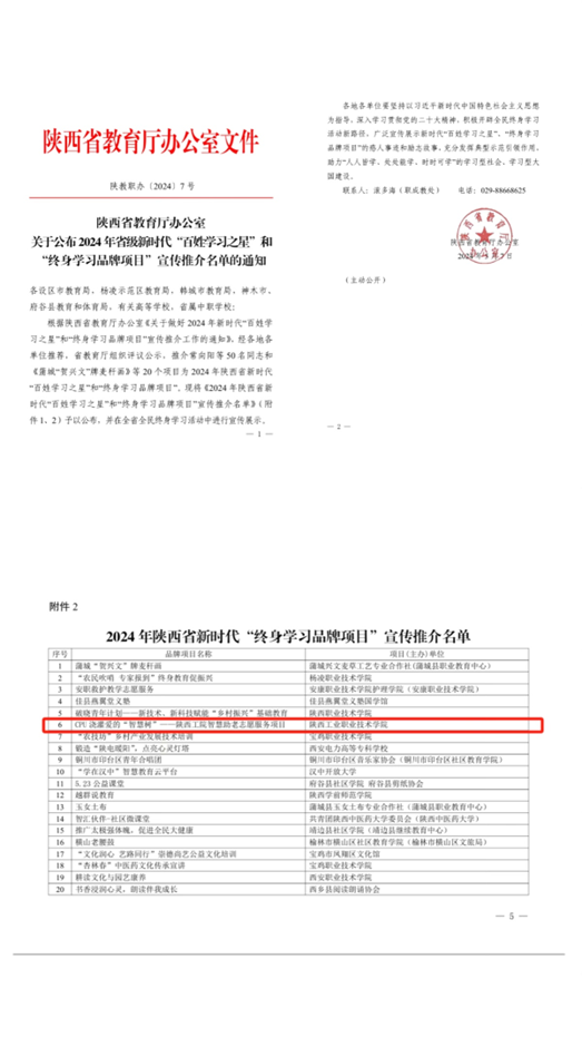 5月7日,陕西省教育厅办公室公布了2024年省级新时代“百姓学习之星”和“终身学习品牌项目”宣传推介名单,我校“CPU浇灌‘爱的智慧树’”志愿服务项目荣获2024年陕西省新时代“终身学习品牌项目”宣传推介名单。
