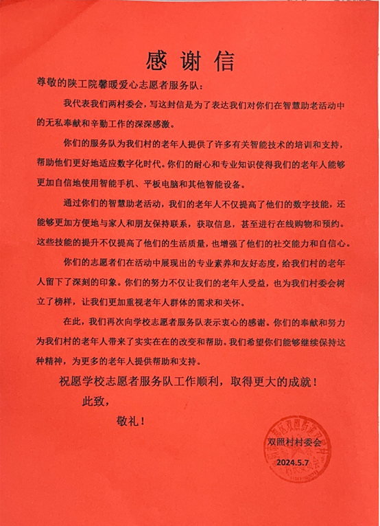 “CPU浇灌‘爱的智慧树’”志愿服务项目以帮助老人跨越数字接入鸿沟、使用鸿沟和信息鸿沟“三代沟”为目标。项目借喻电脑中央处理“CPU”的特点和内涵,将信息学子的专业智慧化作智慧助老的“Center-核心结构”,通过助老实践的“Process-程序化运行”,给项目团队提供培训、队伍建设等补给保障,不断深化项目的“Unite-功能外延”。该项目运行以来,在官方、民间均获得良好评价,咸阳市双照村村委会向服务队发出感谢信,对志愿者帮助村民提升智能产品使用能力的服务表达感谢。