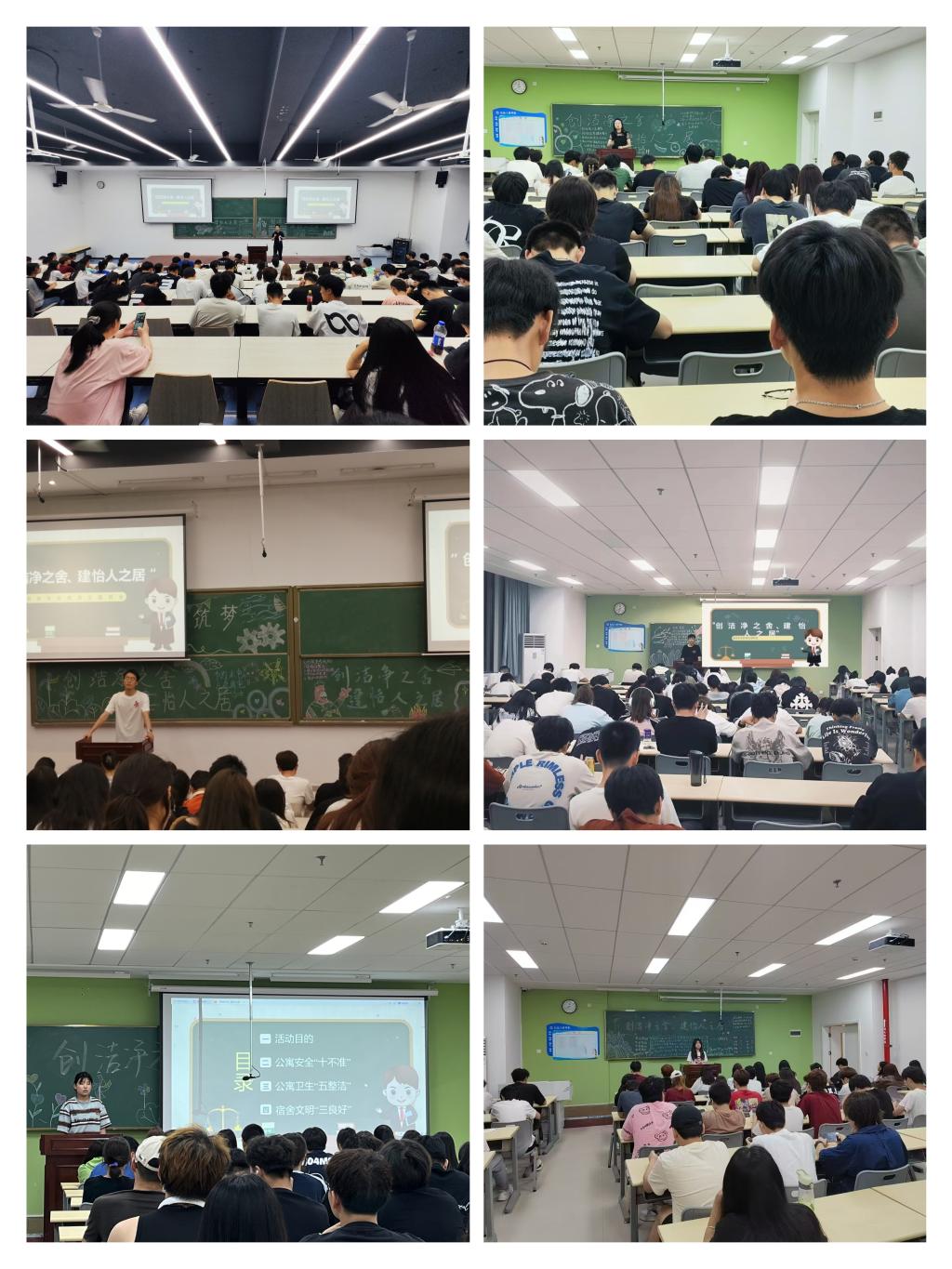 首先,各班班主任强调了本次班会的目的,并通过板报、PPT等形式,向同学们介绍了公寓安全“十不准”,公寓卫生“五整洁”,宿舍文明“三良好”等学校文明宿舍标准,希望大家认识到宿舍安全卫生的重要性,时刻保持警惕,及时报告发现的安全问题,共同维护宿舍的安全稳定。