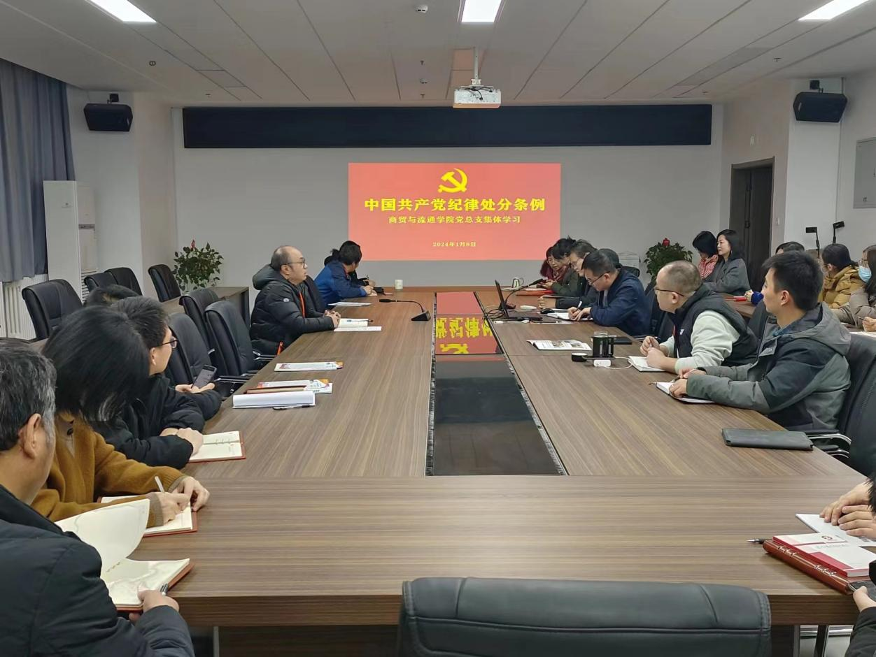 在新时期,加强党的纪律建设是我们党全面从严治党的关键环节。为了更好地贯彻落实党中央关于加强纪律建设的决策部署,1月8日,商贸与流通学院党总支召开“第一议题”专题学习,解读2024年1月1日实施的《中国共产党纪律处分条例》。学习由商贸学院党总支副书记蒋鹏同志主持,商贸学院党总支、各党支部委员、全体党员参加学习。