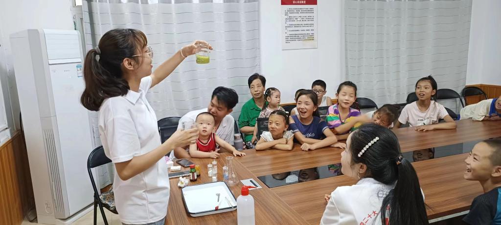 科学实验,让知识放飞梦想。为激发儿童对自然科学的兴趣,暑期社会实践队员们带领学生进行科学小实验,讲解科学知识,通过让儿童亲自动手实验,提高儿童的实验操作能力和科学探究的能力,激发儿童对科学活动的兴趣,使儿童体验科学魅力。