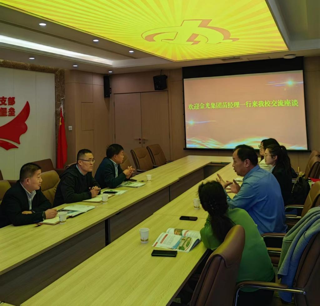 座谈会上,杨书记对苗经理一行的到来表示欢迎。在观看完学校宣传片后,相关负责人介绍了化工专业、电气自动化专业和机电一体化专业的师资力量、学生培养和产学合作等方面的基本情况。苗经理从金光集团的简介、金光集团与高校人才培养合作模式等方面作了专题汇报。随后,双方结合实际情况就校企合作、产教融合、订单培养、顶岗实训等方面进行了热烈讨论。