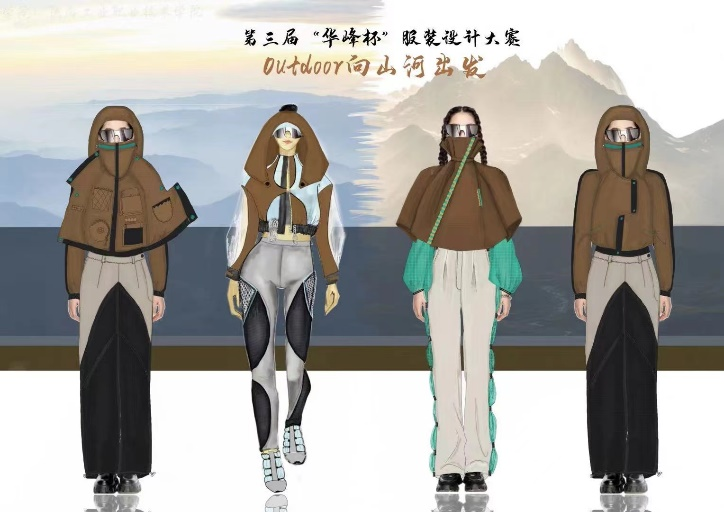本次“华峰杯”服装设计大赛由福建华峰华锦有限公司主办,共收到104件来自全国各地的参赛作品,参赛选手包括来自北京服装学院、天津工业大学、武汉纺大等知名院校。我院学子的参赛作品“崇阿”色彩灵感来源于翡翠山水牌,造型上采用多功能的口袋造型,蜿蜒折转的衣片分割及双层门襟设计,表达了年轻人探索与成长的勇气和现代都市人对绿色,自然的户外探索的向往,贴合大赛“outdoor向山河出发”的主题。本系列作品由袁丰华、钟敏维老师指导,姚柳婷同学设计及制作,贠佳怡同学作为模特进行决赛现场展示。最终经过激烈的决赛,作品“崇阿”以创新的款式造型、完善的功能设置、精湛的工艺细节,最终获得了比赛的最佳工艺奖。