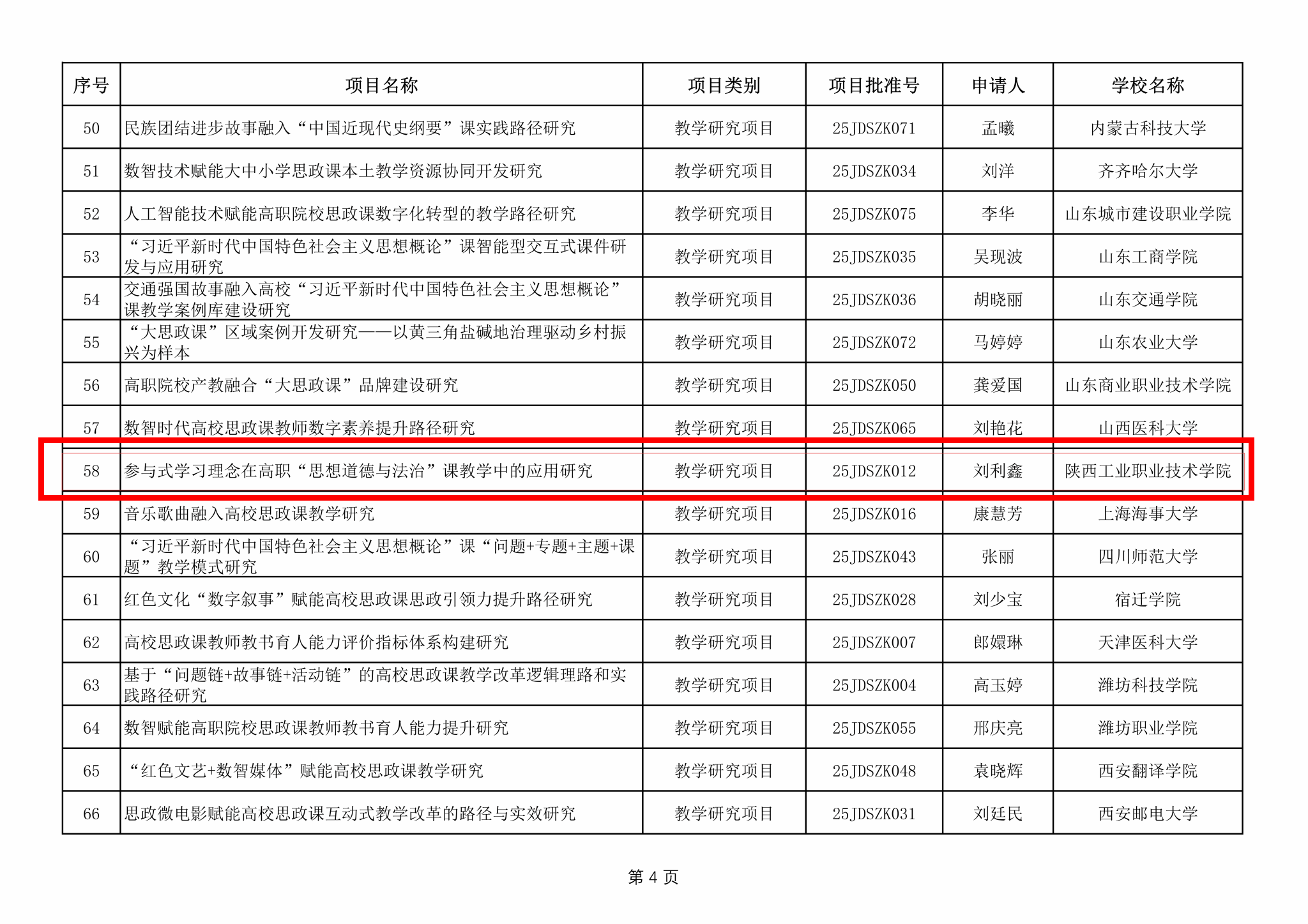 近日,教育部社会科学司公布了2025年度高校思想政治理论课教师研究专项一般项目立项结果,我校马克思主义学院教师刘利鑫主持申报的《参与式学习理念在高职“思想道德与法治”课教学中的应用研究》成功获批立项。此次立项是我校持续加强马克思主义学院和思政课教师队伍建设、深化思想政治理论课改革创新取得的一项重要成果,充分体现了学校在支持思政课教师专业成长与发展方面取得的显著成效。