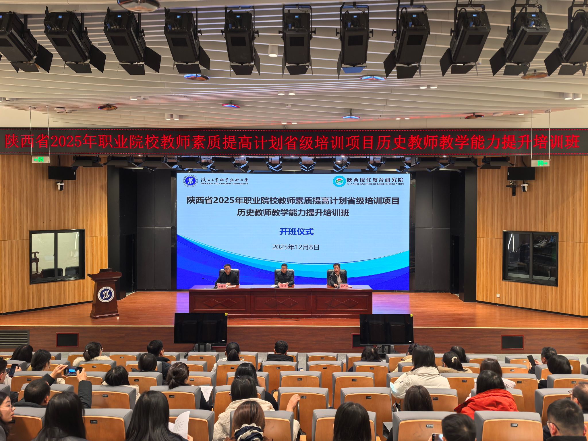 12月8日上午,陕西省2025年职业院校教师素质提高计划省级培训项目中职“历史教师教学能力提升”培训班开班仪式在经开校区启新楼隆重举行。陕西工业职业技术大学继续教育与培训学院院长闫军、副院长贾严鹏,陕西现代教育研究院院长齐博文,培训班相关管理人员及全体学员参加开班仪式。仪式由贾严鹏副院长主持。