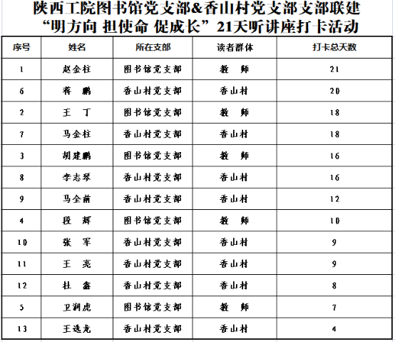 本次活动引入线上学习——“每日30分钟经典视频打卡”,两个支部的党员可以扫码每日在指定界面听书打卡,在21天内党员们连续深度地学习了《平易近人--习近平的语言力量》《新中国外交70年》《习近平关于新时代中国特色社会主义社会建设的重要概述》《习近平科学的思想方法和工作方法》《党的伟大精神永远是党和国家的宝贵精神财富--深入学习习近平总书记关于党的伟大精神的重要概述》等诸多优秀视频。这种即时互动的方式架起了两个支部党员之间的“连心桥”,畅通了大家的阅读道路,拉近了支部间的距离。