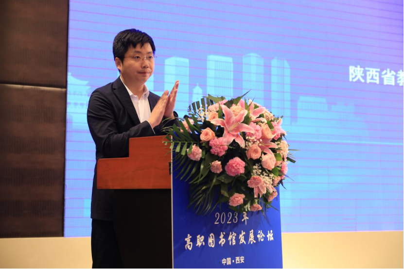 陕西省教育厅职成教处副处长周杰对各位嘉宾的到来表示诚挚的欢迎,并对高职图书馆发展论坛的开幕表示热烈的祝贺。他指出,面对新一轮科技革命浪潮,高职图书馆需要主动变革、积极作为,开辟新赛道,重塑新优势,激发新活力。本次论坛的召开顺应了时代发展大势,抓住了人才培养的需求,找准了图书馆发展着力点。希望借此平台,大家能够深入学习,广泛研讨,积极交流,进一步凝聚智慧、厘清思路,为推动职业教育高质量发展,为教育强国战略贡献智慧与力量。