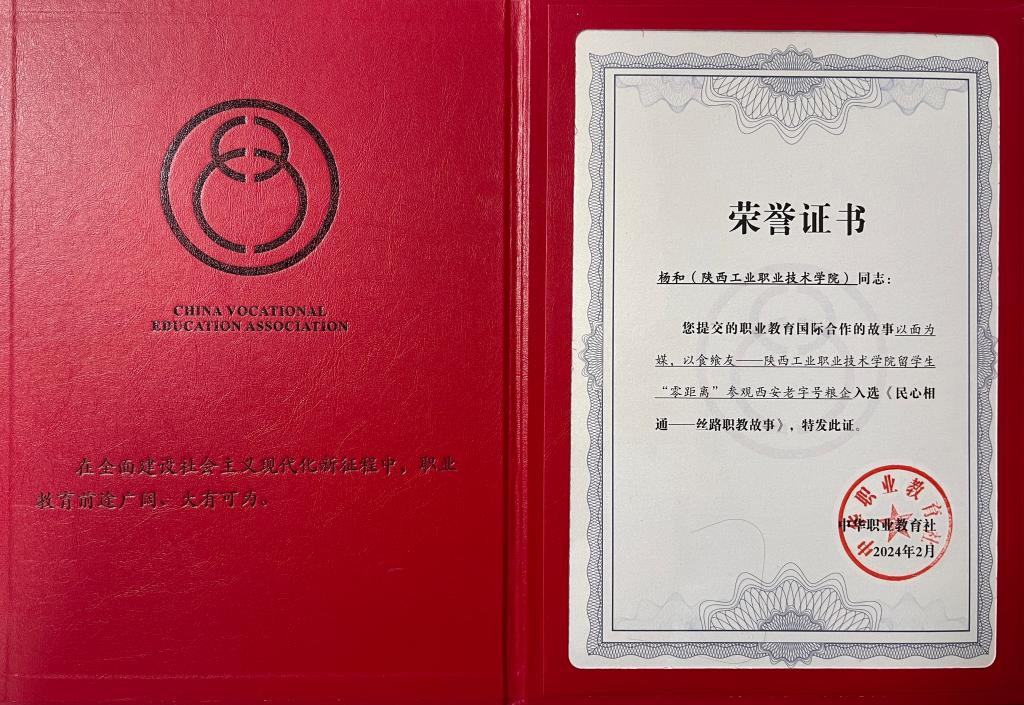 《丝路职教故事》则反映了院校师生和企业职工在职教丝路上结交的真挚情谊,通过讲好丝路职教故事从而积极拓宽中国职教,更深入地链接世界各国文化。我校杨和老师报送的职教合作故事“以面为媒,以食飨友——陕西工业职业技术学院留学生‘零距离’参观西安老字号粮企”成功入选。这为提高国民对职业教育与技术技能人才的社会认同度,为国际交流提供强有力的支撑。