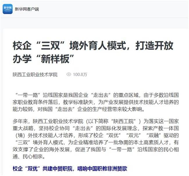 《新华网》刊发我校校长刘永亮教授题为《校企“三双”境外育人模式 打造开放办学“新样板”》的文章,现全文转载如下:《新华网》2022年11月4日校企“三双”境外育人模式 打造开放办学“新样板”“一带一路”沿线国家是我国企业“走出去”的重点区域,由于多数沿线国家职业教育条件落后,教学标准缺失,为产业发展提...