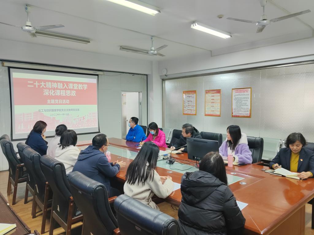 11月17日,化纺服学院教师党支部在崇文楼811会议室开展“党的二十大精神融入教学课堂 深化课程思政”主题党日活动,活动由教师支部书记刘迪主持,全体教师党员参会,会上就更好地把党的二十大精神融入专业课堂进行智慧碰撞。会议要求,各位教师党员要认真制定工作方案,精读深钻,做好足够的知识储备,开展丰富多彩的教...