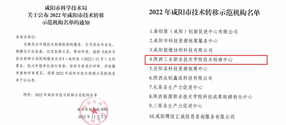 近日,咸阳市科学技术局公布了2022年咸阳市技术转移示范机构名单,经对申报单位进行考查,组织专家评审,并依据考查和评审意见,我校技术转移中心被评定为全市10家技术转移示范机构之一。我校技术转移中心挂靠校科研处,是专门从事技术转移及科技成果转化的服务平台,市级技术转移示范机构的认定充分肯定了我校技术转移...