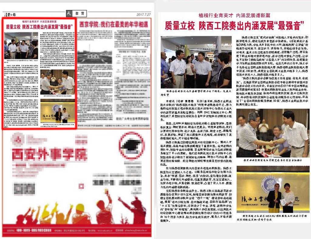 7月27日,《消费日报》刊发《质量立校,陕西工院奏出内涵发展“最强音”》专题文章,关注我院教育教学改革和内涵发展新成就,全文如下:报道链接:http://www.xfrb.com.cn/html/zixun/shenghuoxiaofei/tuijiantoutiao/152873.htm